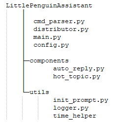 微信助手要成为的目标是一套拥有多种功能的系统,而且功能上要具有易扩展的特性。前面的两篇文章都是作为独立的功能模块开发的,项目文件树如下所示: