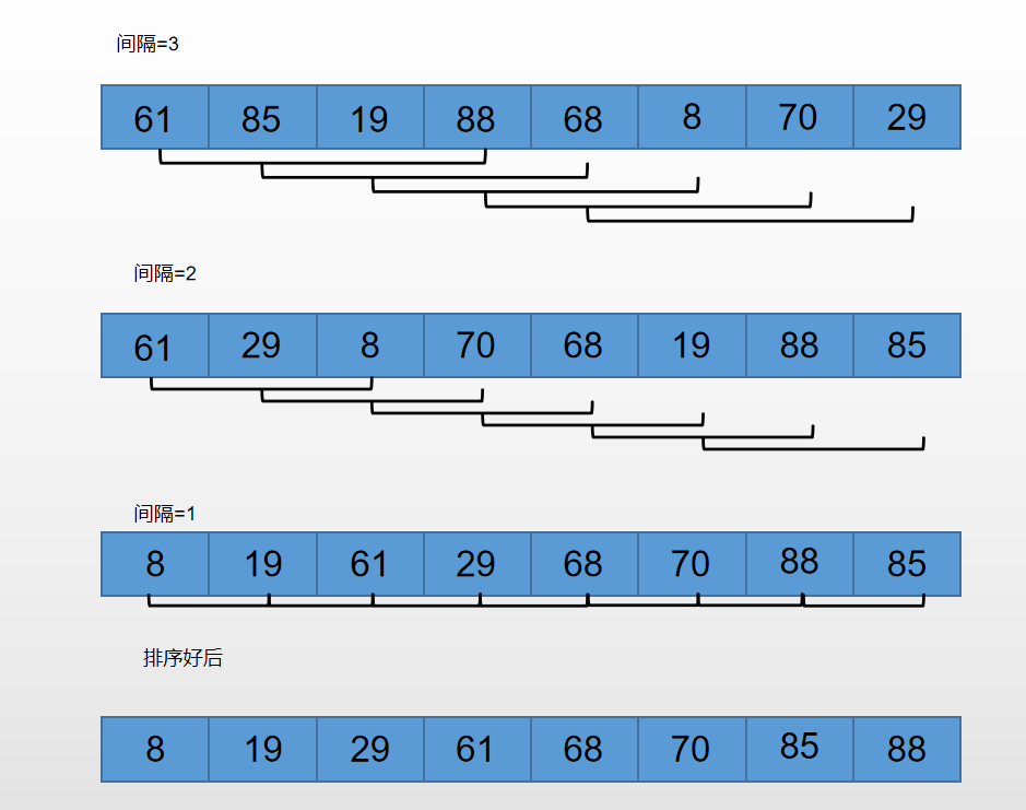希尔排序就是以一个间隔来两两比较大小,如下图
