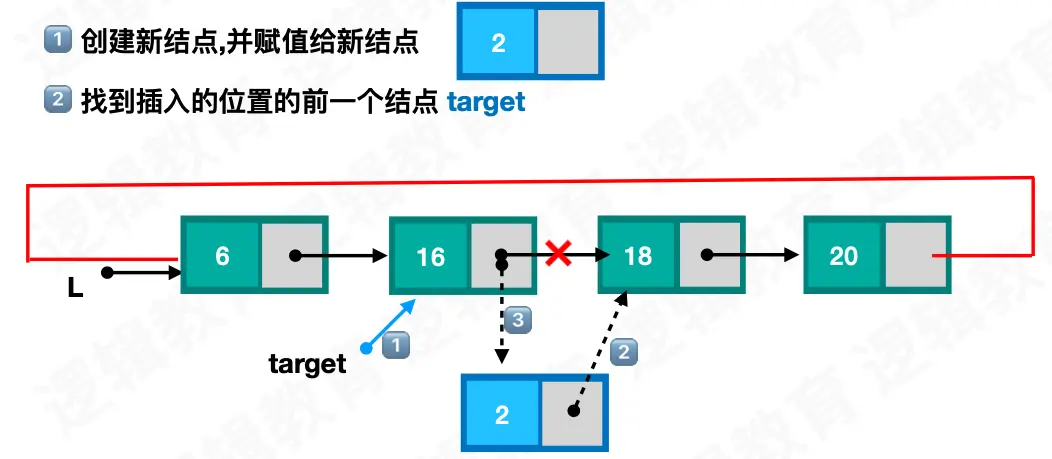 * 插入结点的前驱的next指向新结点,新结点的next 指向target原来的next位置