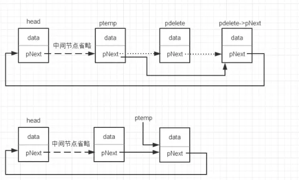 temp,记录删除的节点,即:temp = target->next - 使得