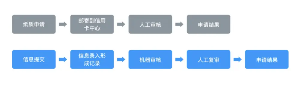 信用卡是银行或信用卡公司发放给信用合格的消费者的信用证明。为了保证消费者信得过,到了时间有能力还款,银行就需要根据申请人的个人信息、交易记录、职业特性、已有资产等等不同维度进行判断。这些数据来自于用户提交、其他银行检索、其他的征信渠道,还要对这些数据进行交叉比对,校验数据真伪,避免诈骗。在人工审核的年代,申请人提交纸质申请,银行将这些纸质表邮寄发回信用卡审核中心,审核员一项项校验核查所有材料,还要交叉检索以核实数据真伪,比如一个在二线城市工作的30岁已成家的白领,他的收入和一年的交易记录是否匹配,其职业信息是否属实,公司运营情况是否稳定等。普通人看着一行行银行收支记录尚且头大,要人工核查这么多的信息,还有等数据之间的往返,就耗掉了大部分的时间。