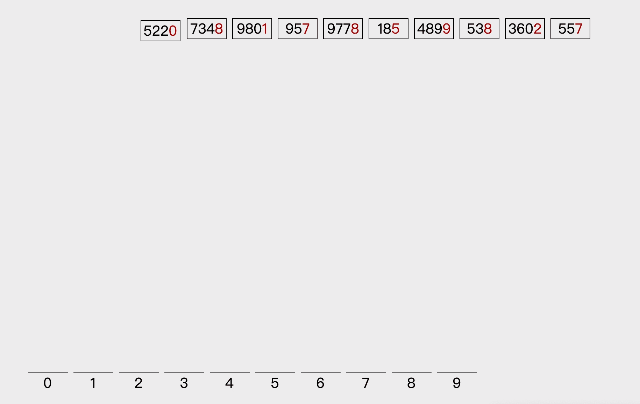 使用十个桶 0-9,把每个数从低位到高位根据位数放到相应的桶里,以此循环最大值的位数次。但只能排列正整数,因为遇到负号和小数点无法进行比较。