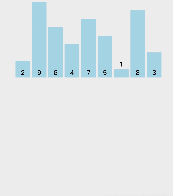思路:每一轮选取未排定的部分中最小的部分交换到未排定部分的最开头,经过若干个步骤,就能排定整个数组。