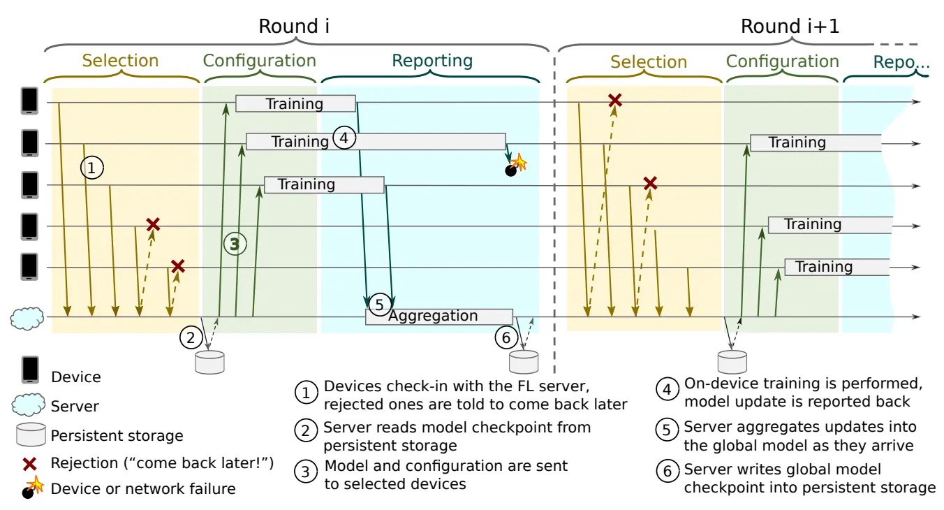 每个 round 开始的时候,server 选中一些 local device 参与到这一轮训练中(一般是全部都选),local device 要从 server 下载当前的 global model,作为自己 local model 的起点。然后每个 local device 以相同的起点,在自己的数据上进行训练,训练一定时间后,这些 local device 把自己的 local model 都上传到 server。server 然后把这些 local model 求平均,并这个这个平均作为最新的 global model。