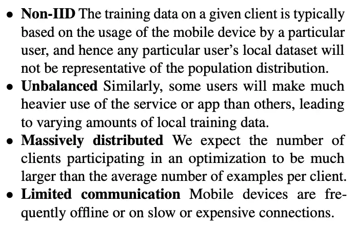 从这个角度来看,Federated Learning 好像也并不是什么全新的概念。如果不用 local device 上面的数据是 IID (独立同分布)的,那么 Federated Learning 就相当于是 Distributed Learning。