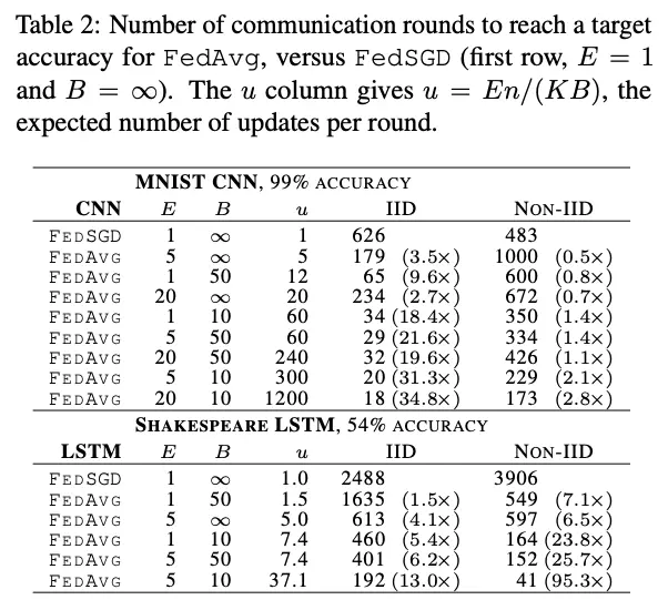 我们来理解一下。En 是一个 round 的总样本数。而且 KB 是一个 step 需要的样本数,所以这个 u 的含义是平均到每个 local device 上面,一个 round 里面有多少 step。但是这里的 K 其实应该是 0.1K,但是因为这个表里的所有试验都是 0.1K,所以乘不乘这个 0.1 也就无所谓了。