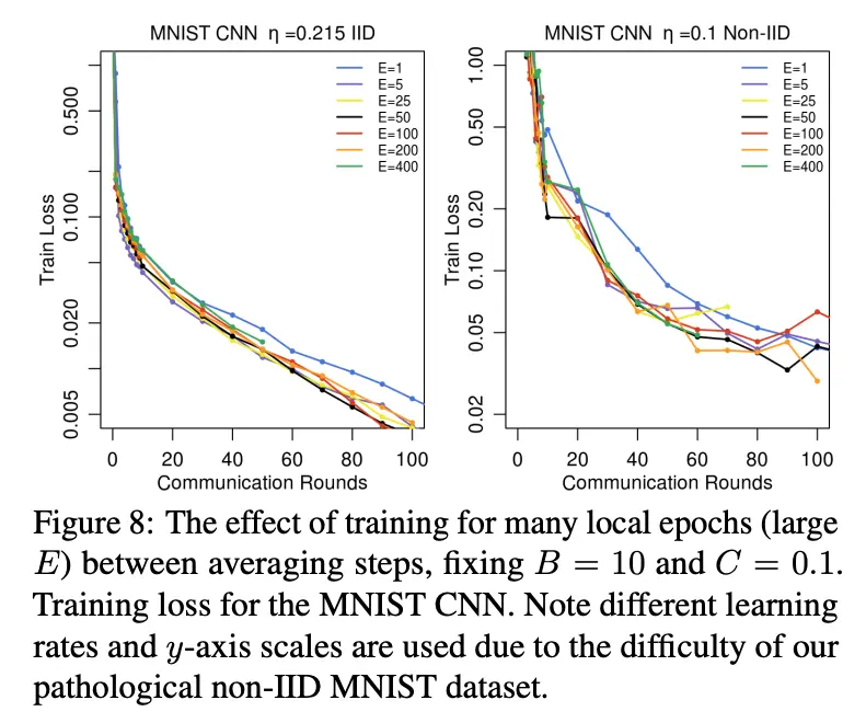 事实证明,E 确实不是越大越好。这件事情说来也好理解,如果在每个 local device 优化的太远的话,那么在 local dataset 就 over-optimized 了,而且这样的话,每个 local model 之间的 bias 也太大了。