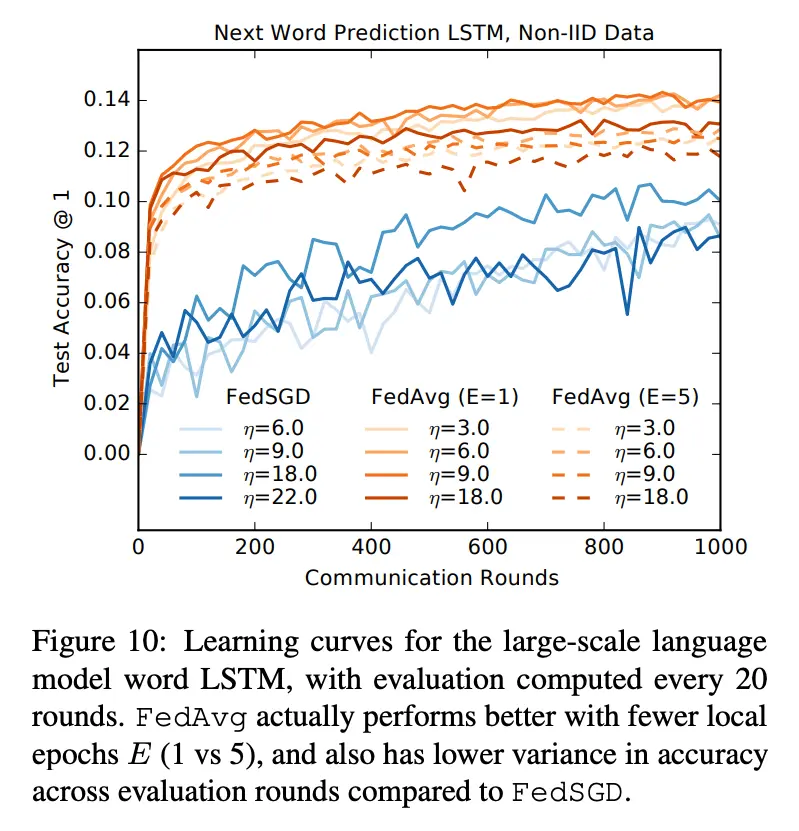这个图的横轴是多少 batch 参与更新。从这个图来看,还是传统的 SGD 效果最好。可以这么理解:SGD 的不同batch 是一种 sequence 的关系。举个例子,第二个 batch 更新的对象是第一个 batch 更新之后那个模型。但是在 Federated Learning 的场景下,由于不同 batch 是分布在不同的 local device 上面的,所以不同 local device 上面的 batch 并不是 sequence 的关系。