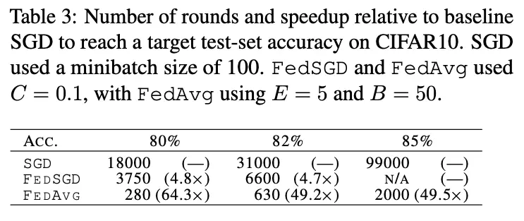 - 有趣的是,FedAvg 的准确率要比 FedSGD 高。作者的解释是 model averaging produces a regularization benefit similar to that achieved by dropout