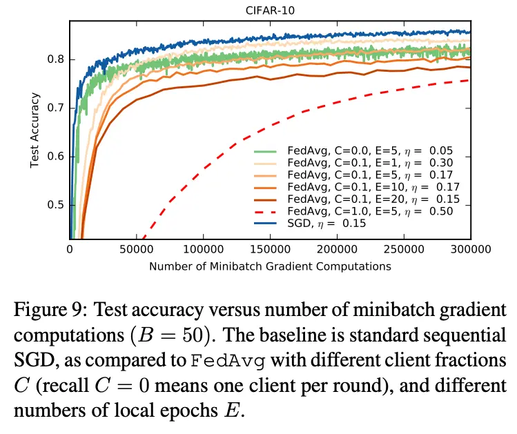 就是说,好像 FedAvg 的曲线比 SGD 的还要更稳定一些。这样的结论其实不负责任的,因为 FedAvg 在画这个图的时候,能够画的点要比 SGD 少很多,所以看起来曲线更加的平滑。这很大可能是因为作图的原因,而非真正的稳定性更好。