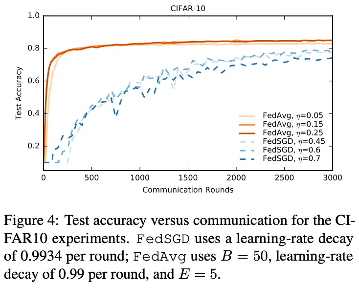 Local Training Steps 最小的情况就是前面说的 FedSGD ,其中 E = 1,B=正无穷。这种方法其实等价于 full-batch (non-stochastic) gradient descent 可以看做是一个 baseline 方法 。但是这种方法其实我们已经知道效果肯定不是很好,因为 generalization ability 不太好。