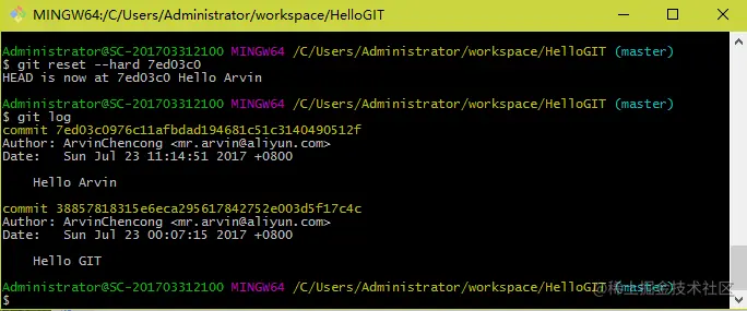 $ git reset --hard 7ed03c0 //回退到Hello Arvin的版本