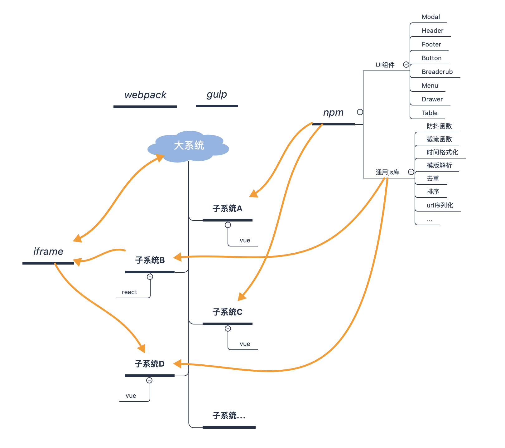 2. 基于MPA + iframe + Webpack实现的微前端架构 基于MPA + iframe + Webpack实现的微前端架构实现和上面介绍的传统架构实现类似,只不过采用了更新的技术栈,以及真正的模块化,组件化技术。笔者之前做的Saas系统就是一个很典型的该方案的例子:
