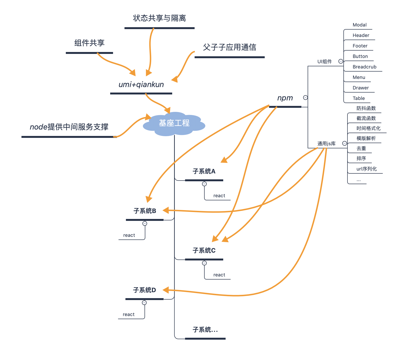 因为我们的前端项目基于umi生态开发构建(之前采用webpack搭建,后面发现umi使用也很爽,就直接基于umi二次开发了),所以很自然的选择了乾坤作为微前端架构。具体架构如下: