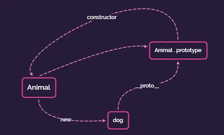 dahuang.getAnimalType ()打印结果为animal,dahuang自身没有getAnimalType ()方法,那么就会去它的_proto_(即它的构造函数的prototype)中寻找,发现Dog中也没有,于是顺着_proto_再往上找,在Animal.prototype.getAnimalType找到,返回结果 。