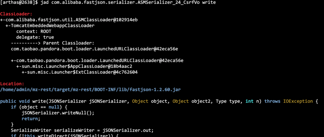 之前碰到过一个 json 序列化时输出的数字带不带引号的问题。当时各种 debug、看代码,发现是通过 ASM 动态字节码的方式生成的序列化类。到这完全放弃了,debug 已经无法定位问题了。当时通过另外一种方式避免了这种问题。 反过来看这个问题的时候,我们可以通过 Arthas 的 jad 命令,反编译动态字节码生成的类,结合 watch 等命令,定位排查问题。jad——反编译指定已加载类的源码