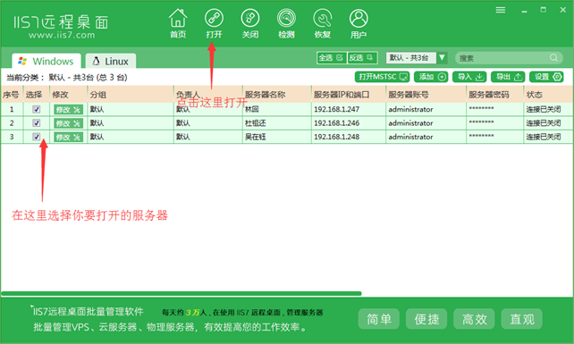 IIS7远程桌面 是专业vps管理服务器管理的工具,功能多样化,并且不断的改善,可批量管理 WIN系列服务器,VPS,电脑 批量导入 服务器的IP,端口,账号和密码 。 批量打开N个服务器的远程桌面 。
