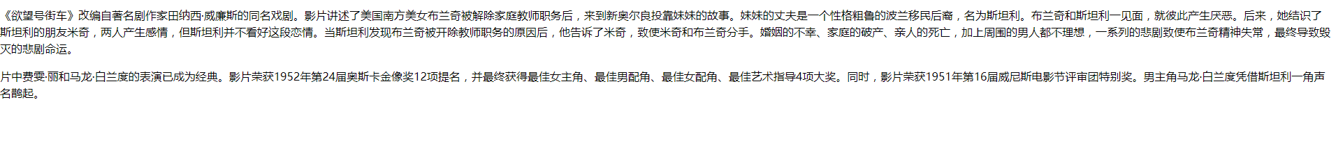 <p>《欲望号街车》改编自著名剧作家田纳西的同名戏剧。影片讲述了美国南方美女布兰奇被解除家庭教师职务后,来到新奥尔良投靠妹妹的故事。妹妹的丈夫是一个性格粗鲁的波兰移民后裔,名为斯坦利。布兰奇和斯坦利一见面,就彼此产生厌恶。后来,她结识了斯坦利的朋友米奇,两人产生感情,但斯坦利并不看好这段恋情。当斯坦利发现布兰奇被开除教师职务的原因后,他告诉了米奇,致使米奇和布兰奇分手。婚姻的不幸、家庭的破产、亲人的死亡,加上周围的男人都不理想,一系列的悲剧致使布兰奇精神失常,最终导致毁灭的悲剧命运。</p>