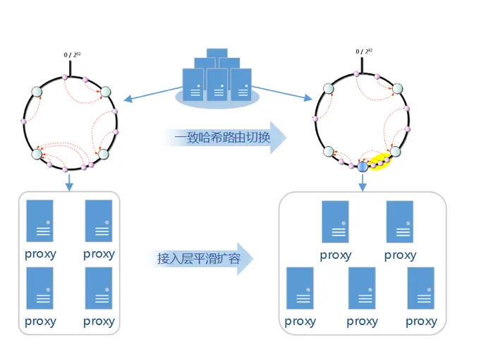 TcaplusDB自研了SDK,SDK内维护了接入层一致性hash环,天然支持增加或者减少接入层节点。