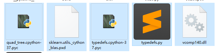 如果还不行的话就把上面那几个文件(下图)复制到打包的路径,并且把名字也改成上面那种名字(如:sklearn.utils._cython_blas.pxd)