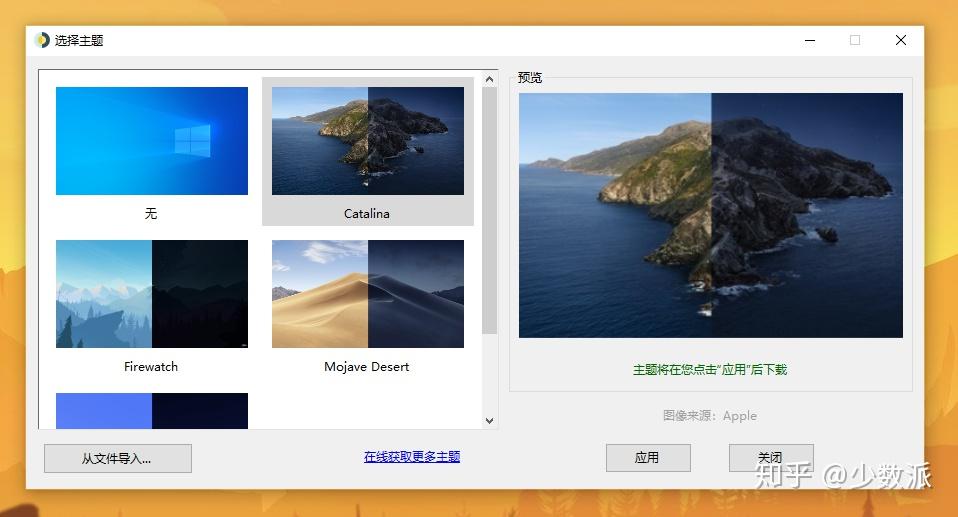 获取到位置信息后我们就能进入 WinDynamicDesktop 的壁纸选择界面了,WinDynamicDesktop 内置了macOS 的 Catalina、Mojave Desert 以及 Solar Gradients 壁纸,在左侧选择好主题之后,在右侧预览窗口中将会呈现出可能的明暗效果,如果满意点击「应用」就会自动下载。