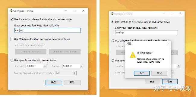 首次打开 WinDynamicDesktop,我们需要根据实际需求选择用于获取地理位置和日落、日出时间的具体方式,支持自动定位或手动搜索选定地址。