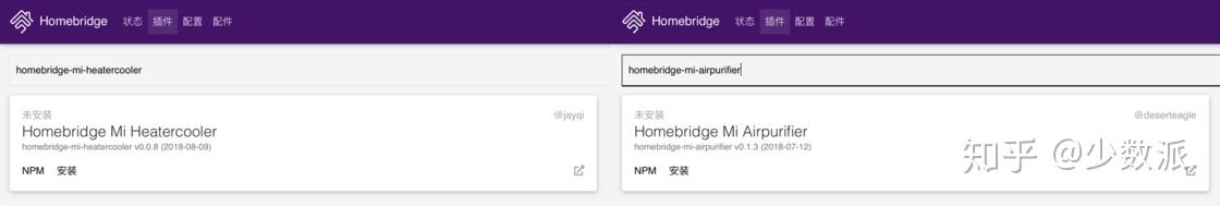 进入到这里之后,我们就可以在插件页面搜索对应的米家插件进行安装。这里我推荐来自「deserteagle」(GitHub 用户名为银行码 YinHangCode)的米家插件,不仅种类较多,而且基本上都能长期稳定工作。这里我们以米家空气净化器和米家空调伴侣作为例子,演示如何将它们接入 HomeKit 中。
