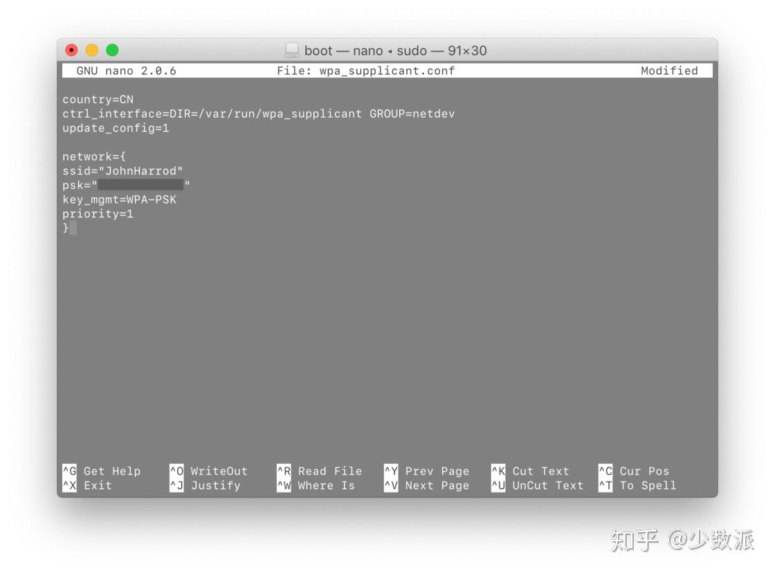 sudo nano wpa_supplicant.conf输入完之后,会提示你需要密码。这里输入你电脑的登陆密码即可。需要提醒的是,输入密码的过程中终端不会显示任何内容,输入完回车就行了。完成之后,你会在终端进入到一个文本编辑器中。在编辑器内复制以下内容,并将对应 Wi-Fi 的 SSID 和密码改成你家的。