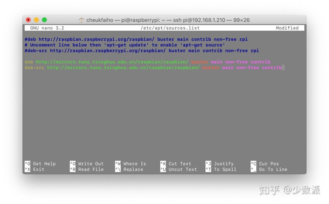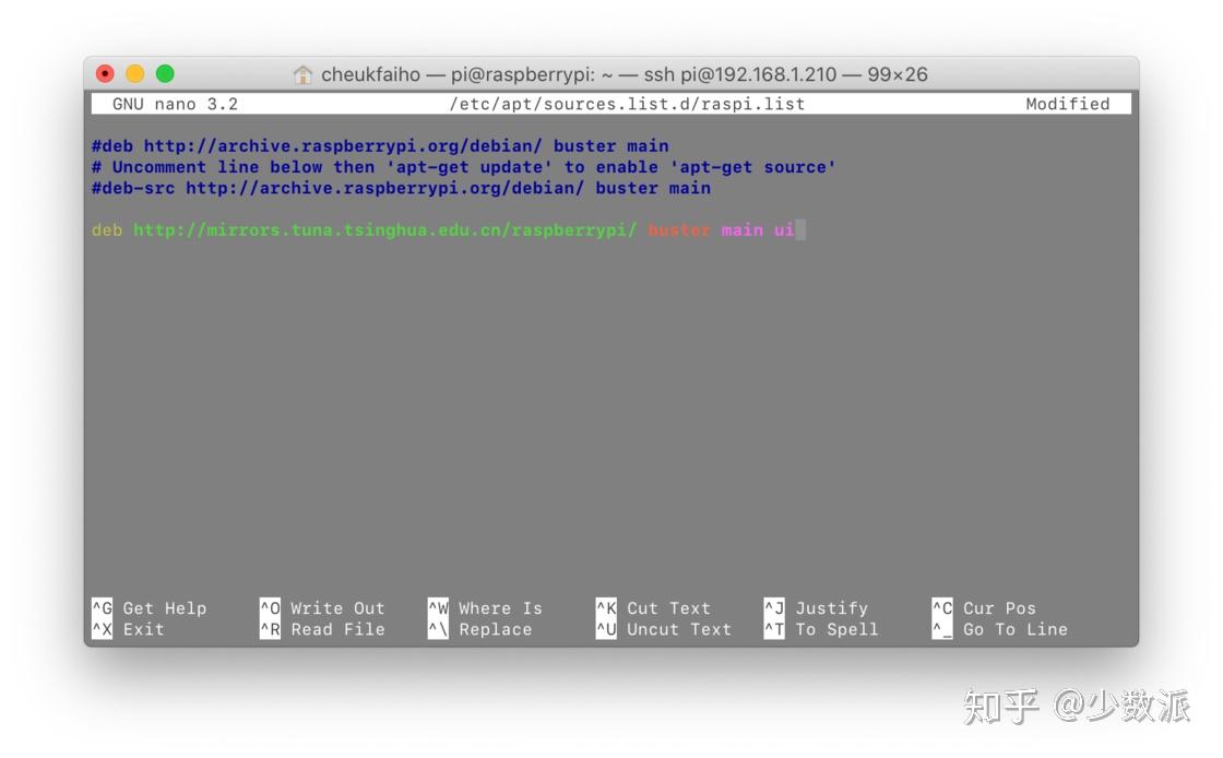 完成后,按下 ⌃control+X,然后输入 y 回车进行保存。接着,继续修改 /etc/apt/sources.list.d/raspi.list 文件,输入: