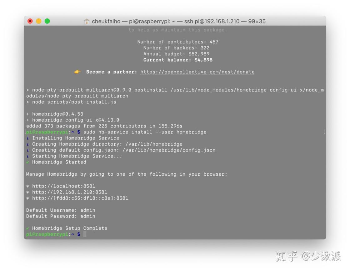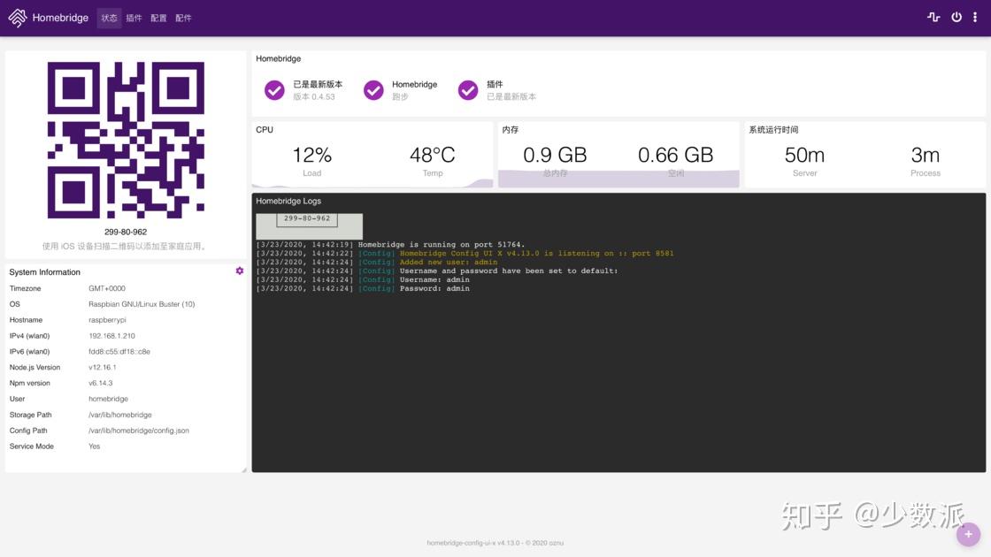 sudo hb-service install --user homebridge需要注意,第二步和第五步由于需要从国外的服务器下载对应的软件包,因此建议大家配置一下网络环境,不然可能会十分慢。其次,第三步中,node -v 的含义是为了查看安装的 node 版本。如果输入之后得到类似 v12.X.X 的结果,那就说明 node 安装成功,可以进行下一步。