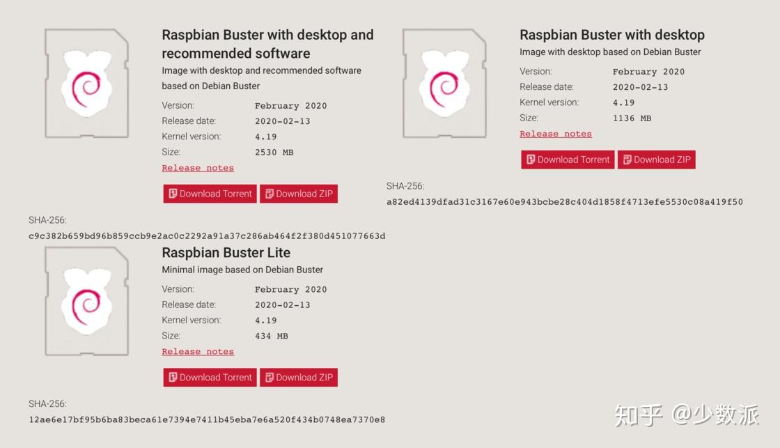 首先自然是给树莓派安装 Raspbian 系统。打开 这个网站,并选择「Raspbian Buster with desktop」进行下载。