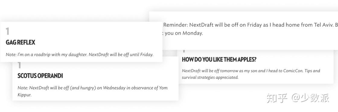 此外,算法虽然可以全年无休、准时准点地生产内容,但机械的精准在很多时候也会令人疲倦。相反,邮件通讯背后的是有血有肉的人,不能守时守量是常态:取决于主编的个人情况,一封平时下午四点递上的通讯,可能提前到两点、推迟到五六点再发,或者干脆连着两三天不发,因为主编要度假、赶飞机、甚至参加家长会。这看似是「缺点」,但反而在某种程度上强化了邮件通讯的人情味。