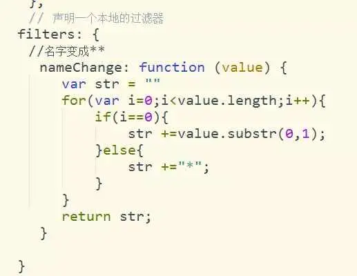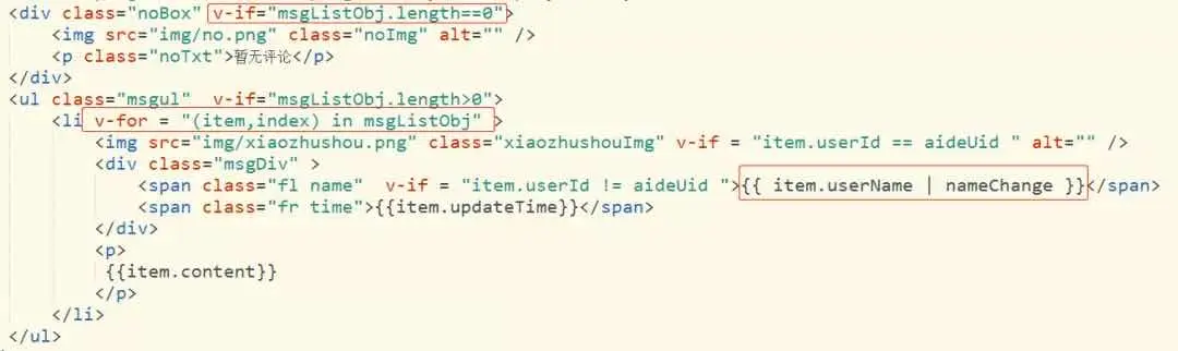 通过vue指令 v-if来判断是否有留言,msgListObj为留言数据,通过接口获取,v-for指令来循环显示出留言,nameChange为自定义过滤器,将用户姓名以姓**的形式匿名展示,过滤器代码如下: