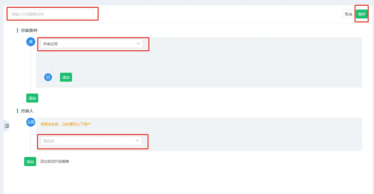 2.输入名称-选择应用-设置分派人-点击保存,用户也可以根据自身需求添加不同的条件,以及添加分派升级策略