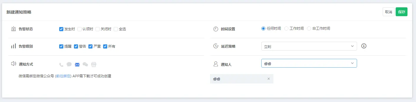 这一点设置的是选择告警发生时的通知方式,其中包含电话、短信、邮件、微信、APP等多种通知方式,用户也可以根据自身需求来设置通知时间以及延迟策略。接下来就说下具体的设置方式吧~