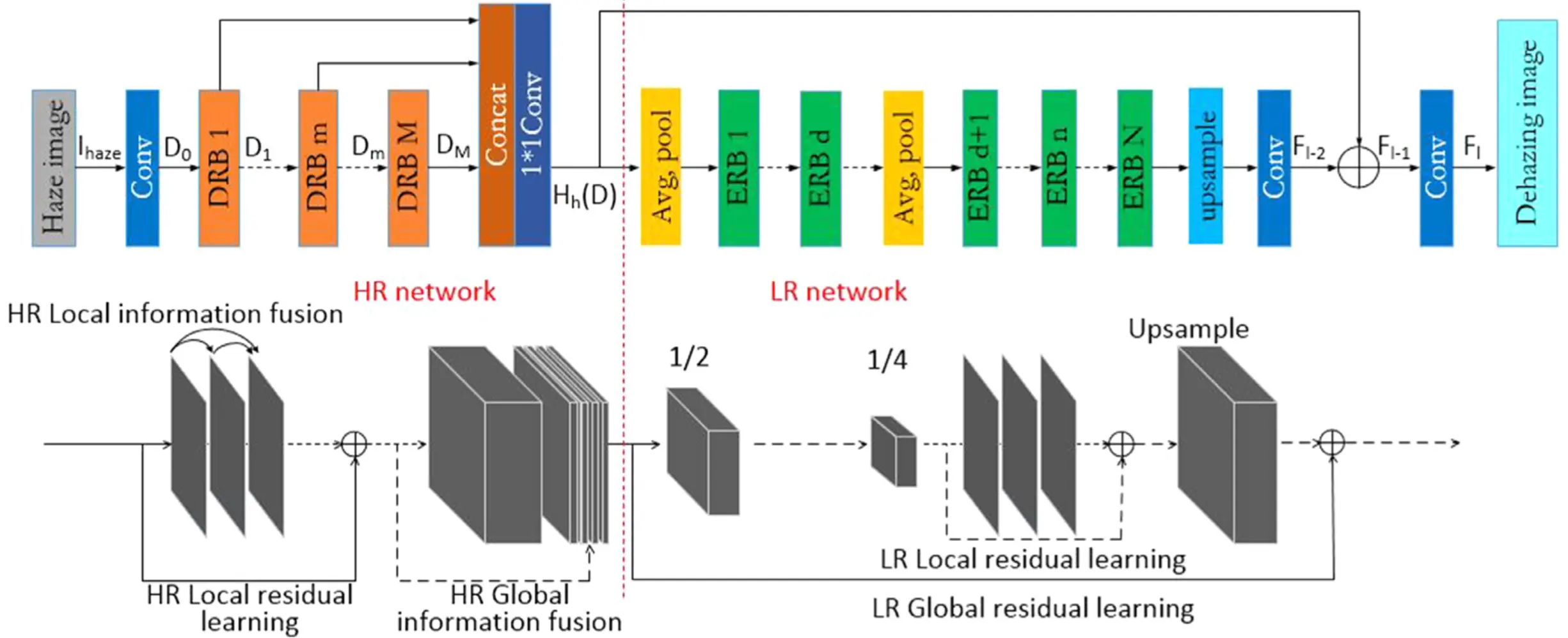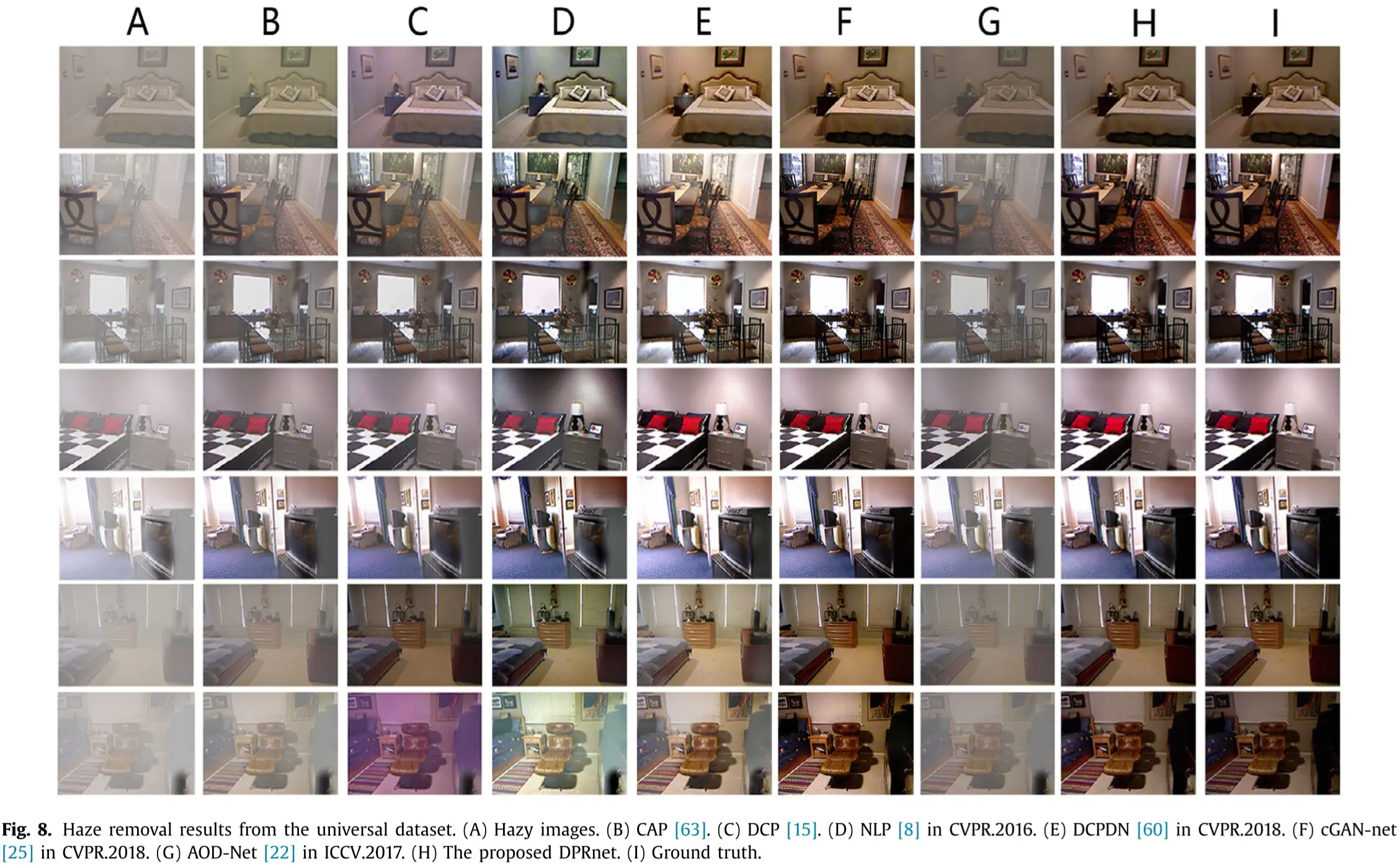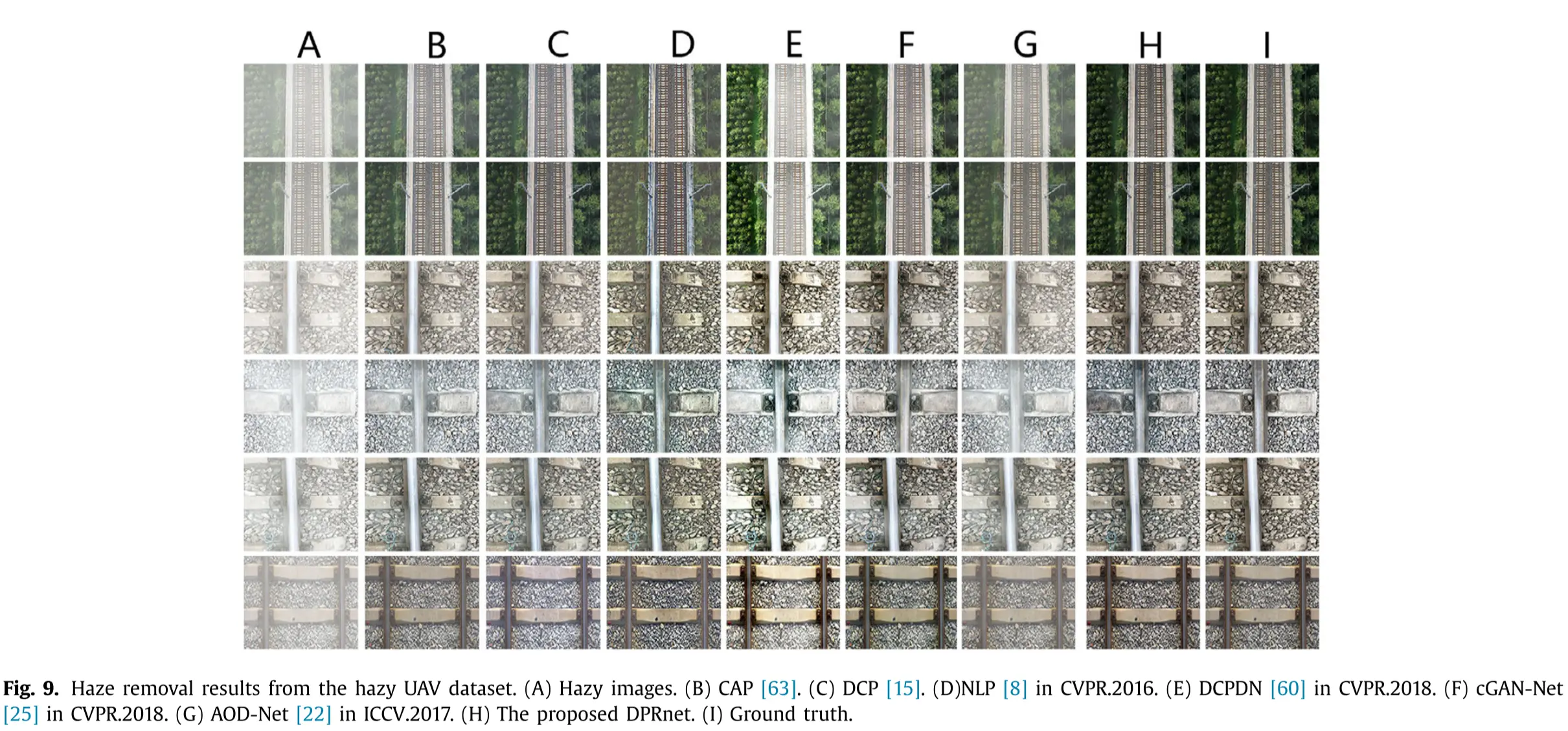 文章是基于无人机的去雾算法。无人机在执行检测轨道任务是,常遇雾霾天气,对检测轨道安全产生了影响。文章对于这一场景做了对应的研究。文章对于网络结果和损失函数做了创新工作。网络结构使用了密集金字塔残差端到端网络(DPRNet),损失函数采用了结构相似性。