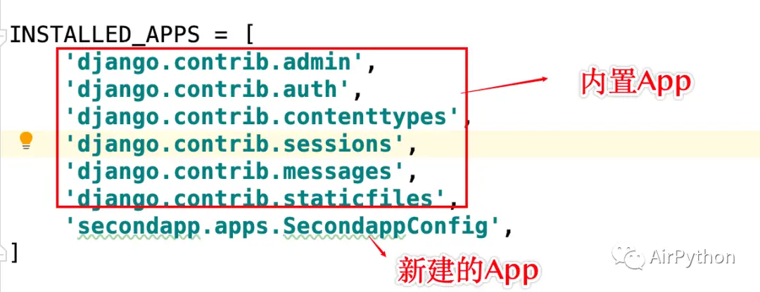 # 设置可以访问的域名# 使用 ['*'] 容许所有域名访问ALLOWED_HOSTS = ['*']内置 App 包含: