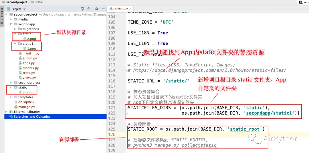 # settings.py# 静态资源集合# 加入项目根目录下的static文件夹# App下自定义的静态资源文件夹STATICFILES_DIRS = [os.path.join(BASE_DIR, 'static'), os.path.join(BASE_DIR, 'secondapp/static1')]# 三个静态文件目录下的静态文件都可以访问# http://127.0.0.1:8000/static/1.pngSTATICFILES_ROOT,即资源部署
