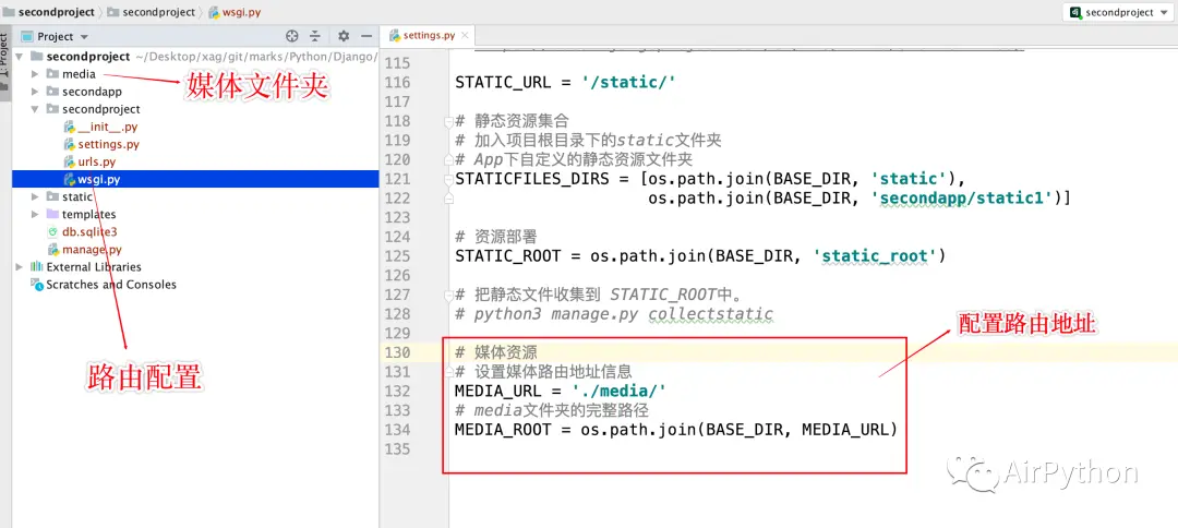 其中,MEDIA_URL 作用是配置媒体资源的路由地址,指向项目根目录下的 media 文件夹