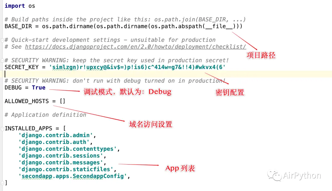 域名访问设置可以访问的域名列表,当 DEBUG 为 True 时,默认只能在本机浏览器访问调试;否则需要填写 ALLOWED_HOSTS,指定容许访问的域名。