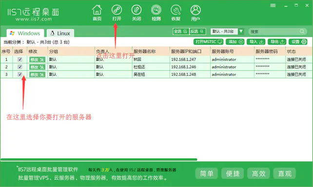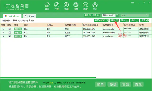 2.IIS7远程桌面 是专业vps管理服务器管理的工具,功能多样化,并且不断的改善,可批量管理 WIN系列服务器,VPS,电脑 。批量导入 服务器的IP,端口,账号和密码 。 批量打开N个服务器的远程桌面 。 3.iis7适用于任何远程win系统