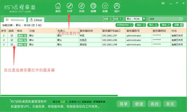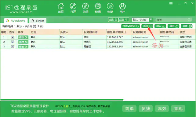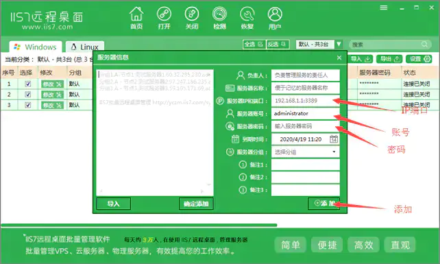 2.IIS7远程桌面 是专业vps管理服务器管理的工具,功能多样化,并且不断的改善,可批量管理 WIN系列服务器,VPS,电脑 。批量导入 服务器的IP,端口,账号和密码 。 批量打开N个服务器的远程桌面 。