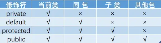 default (即缺省,什么也不写,不使用任何关键字): 在同一包内可见,不使用任何修饰符。使用对象:类、接口、变量、方法。