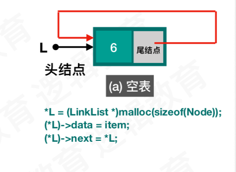 YES->创建一个新结点,并使得新结点的next 指向自身; (*L)->next = (*L);