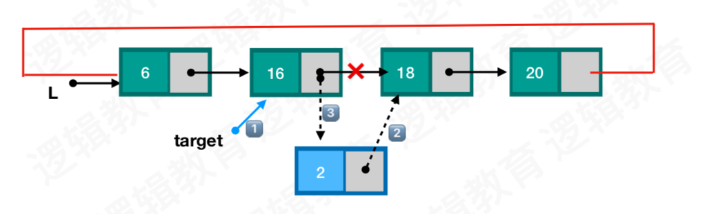 // 1.创建新的结点 temp, 找到插入位置的前置结点,新的结点 指向 前置结点的下一个结点;
