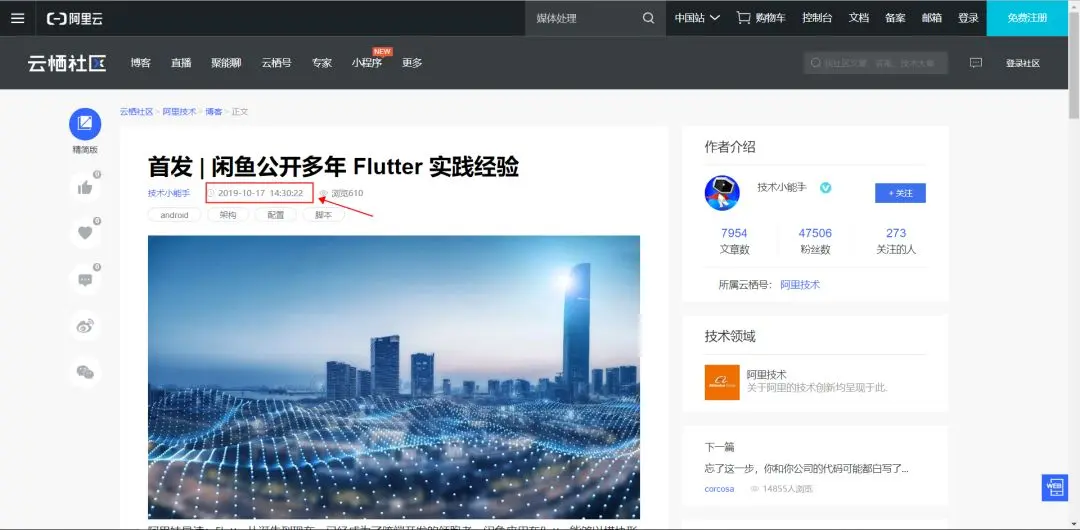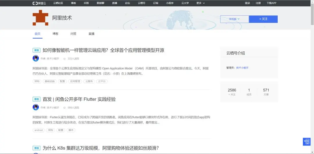 要不我们就比较有代表性的互联网公司BAT里随便找一家吧,看看他们都有些什么高价值的技术资讯。不如就选那个比较高调(非常乐于向业界分享自己技术)的阿里巴巴,因为高调的可能比较好找。他们有个云栖社区,里面有个栏目叫阿里技术(https://yq.aliyun.com/articles/721143),这是一个一直在有规律更新,而且文章质量不错的栏目,界面如下所示。