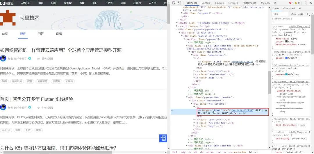上面啰嗦了这么多,还是讲点实在的吧。咱们来真实地爬取点技术资讯。要抓取的内容存在形式是多种多样的,有的被内容服务端直接渲染到了HTML页面上,有的则是在页面中通过JavaScript请求数据,然后再渲染出来的。