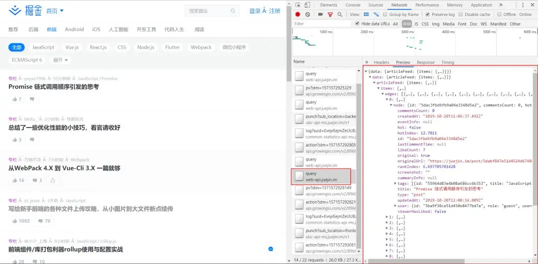 上面是这个对于静态HTML页面上数据的抓取。下面再来看第二种,对于接口中数据的抓取。这里以对知名技术社区掘金的数据抓取为例。