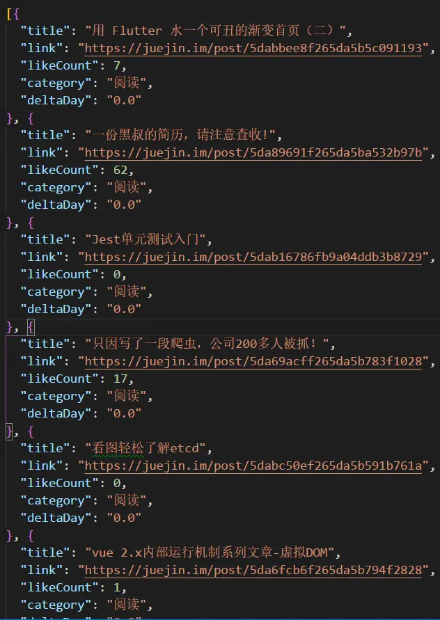 /** * 爬取技术资讯学习举例2 */const rp = require('request-promise');const fs = require('fs');// 类目对应的IDconst categoryIDMap= { '推荐': '', '后端': '5562b419e4b00c57d9b94ae2', '前端': '5562b415e4b00c57d9b94ac8', 'Android': '5562b410e4b00c57d9b94a92', 'iOS': '5562b405e4b00c57d9b94a41', '人工智能': '57be7c18128fe1005fa902de', '开发工具': '5562b422e4b00c57d9b94b53', '代码人生': '5c9c7cca1b117f3c60fee548', '阅读': '5562b428e4b00c57d9b94b9d'};/** * 生成request-promise用到的options参数 * @param {string} categoryID - 类目ID */function generateOptions(categoryID) { return { method: 'POST', uri: ' // 略去了地址 body: { 'operationName': '', 'query': '', 'variables': { 'tags': [], 'category': categoryID, 'first': 20, 'after': '', 'order': 'POPULAR' }, 'extensions': { 'query': { 'id': '653b587c5c7c8a00ddf67fc66f989d42' } } }, json: true, headers: { 'X-Agent': 'Juejin/Web' }, }};/** * 获取某一类目下的资讯数据 * @param {string} categoryID - 类目ID */async function getArtInOneCategory(categoryID, categoryName) { const options = generateOptions(categoryID); const res = await rp(options); const data = res.data.articleFeed.items.edges; let currentCategoryResult = []; data.map((item) => { const linkObj = {}; const { title, originalUrl, updatedAt, likeCount } = item.node; linkObj.title = title; linkObj.link = originalUrl; linkObj.likeCount = likeCount; linkObj.category = categoryName; let deltaDay = (new Date() - new Date(updatedAt)) / (24 * 60 * 60 * 1000); deltaDay = deltaDay.toFixed(1); if (deltaDay < 7) { linkObj.deltaDay = deltaDay; currentCategoryResult.push(linkObj); } }); return currentCategoryResult;}/** * 获取所有类目下的资讯数据 */function getAllArticles() { const promises = []; let result = []; Object.keys(categoryIDMap).map((key) => { const categoryID = categoryIDMap[key]; promises.push(getArtInOneCategory(categoryID, key).then((res) => { result = result.concat(res); })); }); Promise.all(promises).then(() => { fs.writeFileSync('./result2.json', JSON.stringify(result)); });} // 入口getAllArticles();抓取到的结果如图2.8所示,主要抓取了标题、链接、点赞数、类目以及发布距离当前的时间差(天为单位):