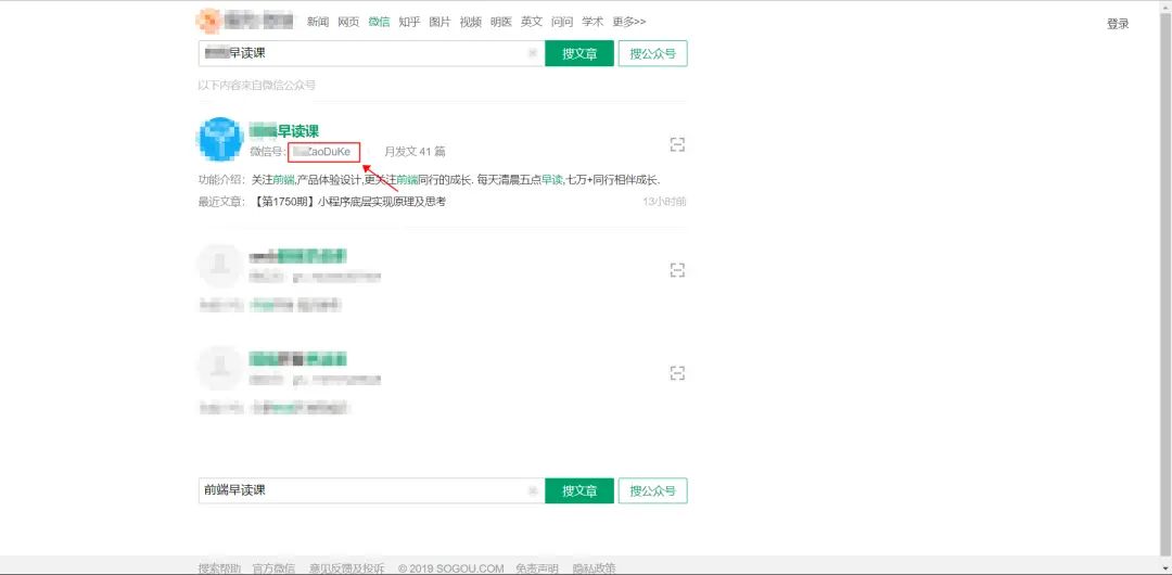 首先,通过(https://weixin.sogou.com/weixin?type=1&s_from=input&query=%E5%89%8D%E7%AB%AF%E6%97%A9%E8%AF%BB%E8%AF%BE&ie=utf8&_sug_=y&_sug_type_=&w=01019900&sut=6202&sst0=1571574212479&lkt=0%2C0%2C0)检索得到该公众号的英文ID。如图2.9所示。